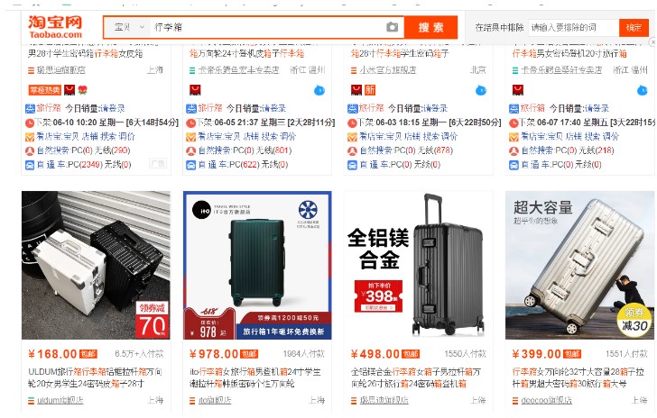 比如上面这张图,第四个宝贝的主图,没有像常规的行李箱摆放的角度去展示款式,而是将行李箱放大,来凸显行李箱的超大容量,这样子在同行中,就通过造型/姿势取得了一个差异化,一下子就能从整个竞争环境中脱颖而出,让消费者关注到自己,而这个产品的造型,往往在详情页中就有很多,我们可以直接用供货商的详情里的图片来做主图;而如果你是厂家,可以在拍照时,额外的多准备一些这样的图片,当备用。
