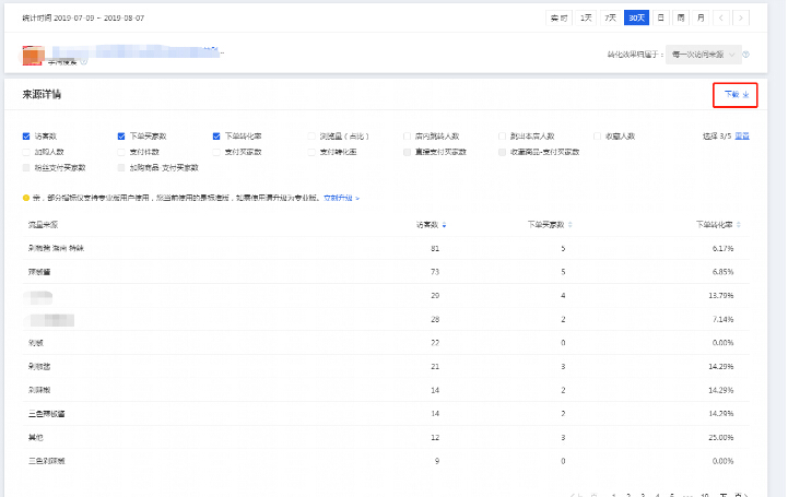 2.打开生意参谋—流量—商品来源—手淘搜索—详情—30天数据下载