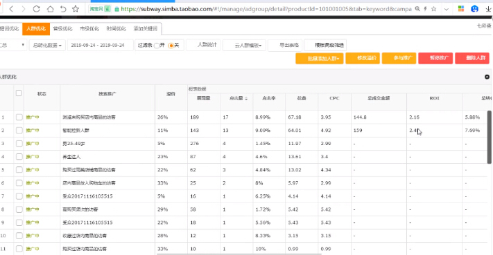 直通车工具,可以从关键词、人群、市级地域、时间、四大模块让你更精细化的优化直通车,清楚的了解关键词的表现情况,展现量和点击量的行业占比,可以了解此关键词的行业占有量。