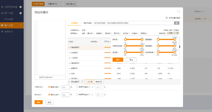 推广计划宝贝推广页面,点击添加关键词,进入系统关键词后台